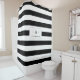 Chic striped shower curtain in classic black and white and white features a center element bearing your single initial monogram and family name.
