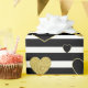 Bold black and white stripe pattern wrapping paper accented with luxe gold-style hearts for a chic, romantic look. A high-contrast design with a modern glam mood.