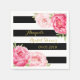 Bridal Shower napkins in black and white stripes with pink watercolor vintage flowers and gold color text.