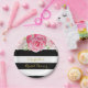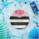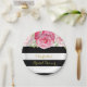 Customizable name bridal shower party plates in black and white stripes pattern with vintage pink watercolor flowers.