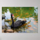 A black swan swims among gold fish in a pond in a park in Hawaii. The Black Swan (Cygnus atratus) is a large waterbird, a species of swan, which breeds mainly in the southeast and southwest regions of Australia.