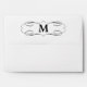 This is your basic white invitation envelope with a solid dramatic black interior. The back flap has an added attraction, a distinguished black swirl frame with your monogram. This formal envelope works well with any 5 x 7 or smaller invitation. To see other sizes available, choose "Customize". You may also use that option to change the outside color of the envelope from white to a variety of colors, or change the font, location, size, or color of the monogram.