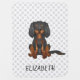 Destei's original cartoon illustration of a cute black and tan color Cavalier King Charles Spaniel breed dog who is sitting. The background has a pattern of gray paw prints. There is also a personalizable text area for a name.