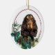 On the front of this Holiday ornament is a beautiful portrait of a black and tan Cocker Spaniel Dog peeking out of a holly and evergreen bough. Red berries and pine cones decorate the holly and pine sprigs. The image is placed on a white circle within a thin red line circle. The back of the ornament has the same evergreen bough wreath and circle with your custom text in red.