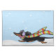 Escape the chill this winter with art, apparel and gifts featuring this cute dog design. Black and tan smooth Dachshund running with scarf and earmuffs. (c) 2012 Off-Leash Art.