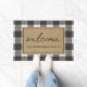 Add a farmhouse style touch to your entryway with this rustic buffalo plaid patterned doormat in black, ivory, and tan. "Welcome" appears in the center in casual handwritten script lettering; personalize with your family name beneath.