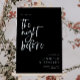 Minimalist wedding rehearsal dinner welcome sign featuring hand lettered script text that says "welcome to the night before." The background is black and the texts are white.
