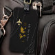 A nice and black luggage-tag personalized with your own initials and name, with the image of the world map and an airplane.
