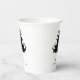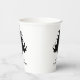 Merry Christmas paper cups in black and white. Pine tree with swirling branches in black is the image on front and back. Customize with text that also prints on both sides, beneath the tree design.