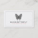 Simple ornate black tribal butterfly illustration over white background. Black dots border accent.