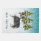 Destei's original cartoon illustration of a black tricolor coat color Pembroke Welsh Corgi breed dog. The dog is placed in a winter scene with three green fir trees and falling snow. The background is a blue to white gradient giving the design that cold winter day look. There is also a personalizable text area that now reads: "Merry Christmas!".