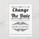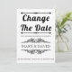 Vintage elements and black and white typography wedding Change the Date postponement announcement. This elegant wedding design displays the text "Change the Date" in bold black typography and vintage elements that form frames for the text. The back features a geometric pattern.