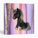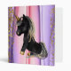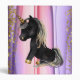 Cute black magical watercolor unicorn with pastel pink ears and ombre gold and black mane and tail set on a fantasy curtain of purple and pink shades of color with gold accents. A colorful and unique addition to a unicorn party.
