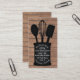 A business card for the food industry featuring an illustration of a spoon, whisk, and spatula in a crock over a wood background. Personalize the text on front.