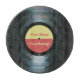 A glass cutting board with a music theme. It looks like a vinyl or phonograph record from the era of the record player. The disk's surface is black with light reflected off the spiral groove and a center label in yellow and red surrounding the hole about which the record would rotate. Personalize with your name or your text or message above and below on the label area. Please note that this is a printed image and does not have a hole in the center.