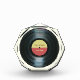 This award features the image of a vinyl record from the era of the record player on its surface. The disk is black with light reflected off the spiral groove and a center label in yellow and red surrounding the spindle about which the record would rotate.
