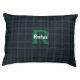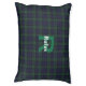 Classic plaid pet bed done in the traditional Scottish green and blue Black Watch plaid pattern. A single large green one letter monogram, in the middle of the bed, has white text running through it. Personalize with your pet's name and monogram, or even your family name. Makes a great gift idea for any dog owner.