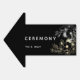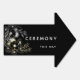 Elegant, simple, boho chic, black and white wedding ceremony directional arrow yard sign with gilded silver and gold lace and modern calligraphy script.