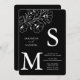 Make a bold statement with these black wedding invitations featuring delicate white line art florals on a solid black background. The design highlights the bride and groom’s initials, names, and event details in crisp white type for a sleek, elegant look. The reverse side continues the theme with a solid black background and matching floral art in white, creating a coordinated and polished finish.