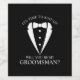 featuring a tuxedo suit and bow tie illustration with groomsmen proposal message in a classic serif font.