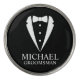 featuring a tuxedo suit and bow tie illustration with a personalized groomsman's name and title in a classic serif font.