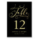 This table number card features whimsical flourish gold typography on a black background. You can add your details in the customize menu. This menu is part of a beautiful matching wedding suite that can be fully personalized.