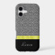 The abstract black and white optical design on the upper two thirds of this case, paired with the black bottom third and a gold ribbon separating the two makes a uniquely elegant case! Add your own name as personalization, and the package is complete. **Please note: the image is printed on the case and contains no actual fabric or ribbon.**
