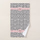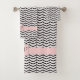 The classic combination of black and white are accented with layers of blush pink in this trendy and classy chevron pattern with layers of different thicknesses to break things up. Customize the monogram on the hand and bath towel for a unique decoration for your bathroom. These items can be bought as a matching set or as individual pieces.