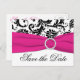 This black, white, and fuchsia damask save the date post card matches the wedding invitations and other items shown below. If you require any other matching items in this design, please email your request to niteowlstudio@gmail.com.