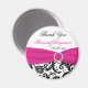 This black, white, and fuchsia damask thank you magnet matches the invitations and other items shown below. You can also select a square shape, or smaller/larger round one. If there are any other matching items you require, please email your request to niteowlstudio@gmail.com.