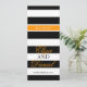 Double-sided simple black and white stripe with touches of bright orange wedding reception dinner menu. Personalize with your own menu details.