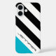This trendy, modern black and White personalized case for the iPhone is great protection and decoration for your new cell phone. Funky diagonal stripe design is chic, elegant, and eye catching! Touch of aqua blue adds excitement. Easy to personalize name. All Rights Reserved © 2024 Alan & Marcia Socolik.