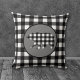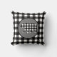 The background on this attractive throw pillow is a black and white buffalo plaid pattern. At the center is a gray circle banner with a matching plaid bear image. The back of this reversible pillow has the same buffalo plaid print, but not the bear design. Be sure to see the matching products in our store.