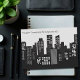 Our company has moved to a new location. Modern, custom city skyline at night drawing in black and white on customized moving announcement cards for your business. Chic corporate relocation card for professional marketing to clients and customers. .