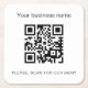 A stylish, classic white background. Personalize and add your business name, your own qr code and a text. Black text.