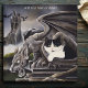 A black and white tuxedo kitten is sitting with a gargoyle, Behind them is a gothic castle with dragons.