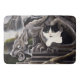 Black and white tuxedo kitten is sitting beside a gargoyle. Behind them is a castle and dragons.