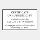 Minimalist certificate of authenticity sticker in black and white to which you can add your name inside a clean black frame.