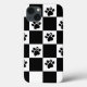 Horizontal black and white checked background and black paw prints in white squares. There is a small white heart in each pawprint