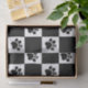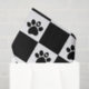 Horizontal black and white checked background and black paw prints in white squares. There is a small white heart in each pawprint