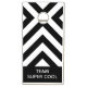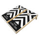 Modern black and white chevron patterns point to the target on each cornhole board. A matching black band across the bottom features custom team names. Personalize the text however you wish in the sidebar. You can also customize the bag colors.