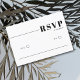 This wedding RSVP response card features a stylish and uncomplicated typography design that exudes elegance. The use of black and white enhances its minimalist aesthetic, with plenty of white space to elevate its overall appeal. A sleek horizontal line adorns the top of the card, adding a visually captivating element. The word "RSVP" is cleverly positioned to create the illusion of extending towards the right side, adding a touch of sophistication. Furthermore, two circles are provided for guests to easily indicate their attendance or absence, making it a practical and visually appealing option.