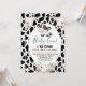Cute holy cow themed birthday invitation for a little girl in a bohemian style featuring a cute black and white cow, some sweet boho floral arrangement with pampas grass, and white orchards, and a black cowhide pattern background. This design is suitable for any age.