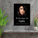 A welcome board for a 21st (or any age) birthday party. Personalize and add a photo, a name and age. A classic black background, white text.