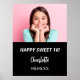For a Sweet 16 party. Black background. Personalize and add your own high quality photo of the birthday girl. The text: The name in white with a modern hand lettered style script. Tempates for a name, and a date.