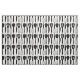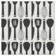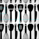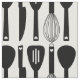Black and white cooking pattern with black kitchen utensils adorned with little hearts. Balloon whisks, knives, spatulas, and ladles.