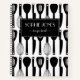Black and white recipe book printed with a cooking pattern with black kitchen utensils adorned with little hearts. Balloon whisks, knives, spatulas, and ladles. Personalize with your name in elegant retro letters. Recipe book is written in a charming script.