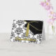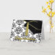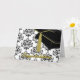 Elegant graduation greeting card, done in a black and white damask pattern, with graphics of a black graduate's mortarboard cap, with a gold tone tassel, in the upper right corner. Gold tone graphic script text reads Congratulations, on the front. Black text greeting, on the inside, is ready to personalize to read what you want. Pretty card to your favorite graduating girl.
