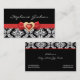 Black white damask pattern with red bow and jewel business card template that features a black and white damask pattern and a red ribbon across it with a bow and a heart shaped jewel also in red with gold outline and strass which adds a little bling. Note the bow and the heart diamond jewelry is a "printed on" illustration and not a real crystal, so are the strass. An elegant and stylish feminine business card design. Trendy, fashionable and modern perfect for professional or personal use.