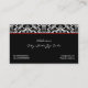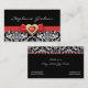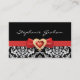 Black white damask pattern with red bow and jewel business card template that features a black and white damask pattern and a red ribbon across it with a bow and a heart shaped jewel also in red with gold outline and strass which adds a little bling. Note the bow and the heart diamond jewelry is a "printed on" illustration and not a real crystal, so are the strass. An elegant and stylish feminine business card design. Trendy, fashionable and modern perfect for professional or personal use.